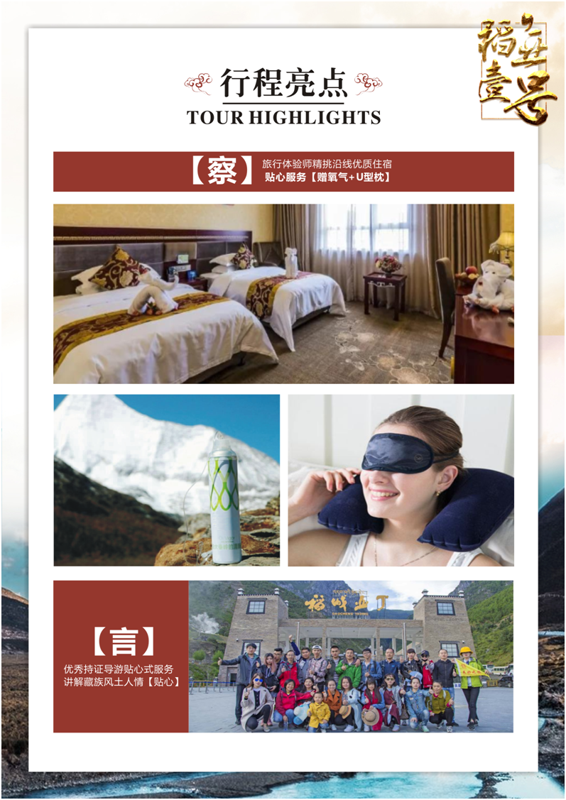 1、关于车辆交通:目前四川旅游市场方面,因8座以下车辆无法办理旅游牌照,游客需对此情况明白无误,不得以此为理由提起投诉。长时间高原行车,途中车辆负荷较重,可能会遇到汽车抛锚并影响行程的情况,请游客做好心理准备。如遇人力不可抗拒因素,如塌方、路阻、车辆故障,当地政府行为等造成行程延误,或不能完成上述景点,责任不在旅行社,旅行社不承担赔偿责任,由此产生的超支费用由游客自理。但我公司会积极配合解决。
