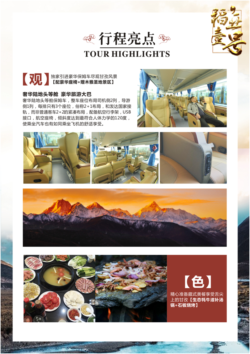 ●中午:经【二郞山】欣赏“一山有阴阳”的两种截然不同的奇观,到达大渡河谷(川西最大最深峡谷),远眺大渡河风光,经情歌故乡【康定】海拔2500米,车窗欣赏景色如画的小桥、流水、人家、藏式民居风光,感受浓郁高原藏家风情。翻越有“康巴第一关”的塞外屏障【折多山】,它为大雪山一脉,是重要的地理分界线。最高峰海拔4900米,垭口海拔4298米,也是川藏线上第一个需要翻越的高山垭口。赠送【木雅圣地】景区:(此景点为赠送景点,如因天气、堵车、交通管制等特殊原因不能前往,费用不退)此地相传为藏王松赞干布第四个王妃木雅公主-嘉姆尊的故乡,康定木雅圣地景区:坐落于享誉世界的情歌之城――康定折多山西侧的“木雅辛康”,是甘孜州第一座以民俗风情与自然风光相结合的旅游景区,也是全国第一个以体现藏族木雅文化为主题的专题旅游区,乘观光车(60/人自理)【木雅花宫】“木雅花宫”座落的山顶,曾是当年木雅公主少年时期经常玩耍的地方,每当春季来临,山沟及山坡遍开格桑花,将大地披上了一件美丽的外衣,每到此时,木雅公主都要到山顶观花踏春。如今在山顶建巨型格桑花建筑,取名“木雅花宫”,意在对美丽的木雅公主的怀念。【花海寻踪】“花海寻踪”是“木雅辛康”景区中野生花卉开放最为集中的地方,这里曾是当年木雅国王和木雅民众举行节庆活动和举办盛大典礼的地方,也是木雅公主最爱游玩之地。当地民众说,因为木雅公主爱这地方,所以这里的花开得最早,也开得最茂盛。今天,当我们信步其间,你不觉得我们正在寻觅当年木雅公主的踪迹吗?【梵音送福】然梯寺是木雅地区享有盛名的藏传佛教寺庙。创建于1364年,距今已有600多年的历史。早期然梯寺因嘎玛巴玛哇四世偌勒毕多吉、嘎玛六世、七世和八世等藏民族圣人相继光临并弘扬嘎玛藏传佛法,故然梯寺为木雅地区嘎玛教派的一个重要传承场所。传承300余年,后因多种原因,寺庙被毁,直到十八世纪末,达尔庆尼玛扎巴的转世仁真将勒巴尔益西君来此光复基业,并开始传承尼玛教派的结晶大宝(佐庆)寺的传统并得以发扬光大,于是然梯寺遂成尼玛教派至今。寺内高僧大德受当地百姓敬仰,每日香火不断。暮鼓晨钟,梵音飘飞,福佑一方。后乘观光车出景区。